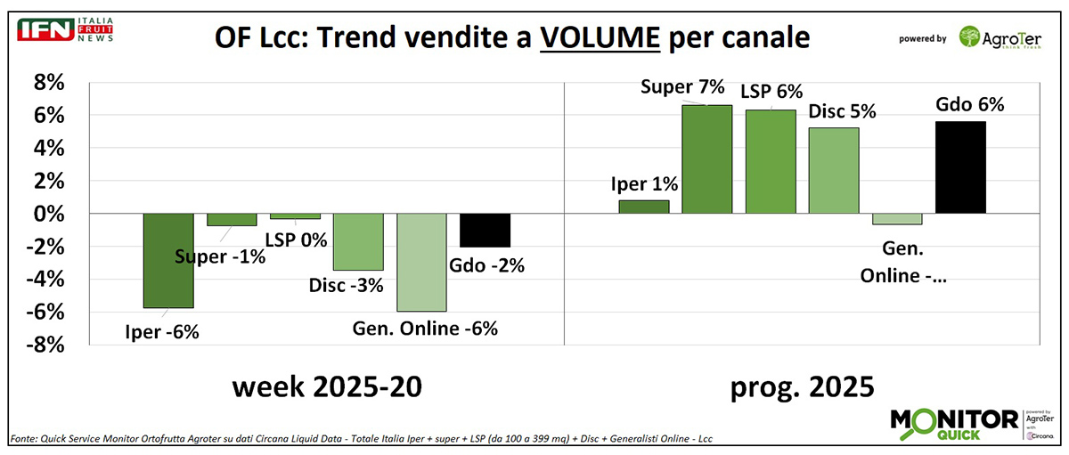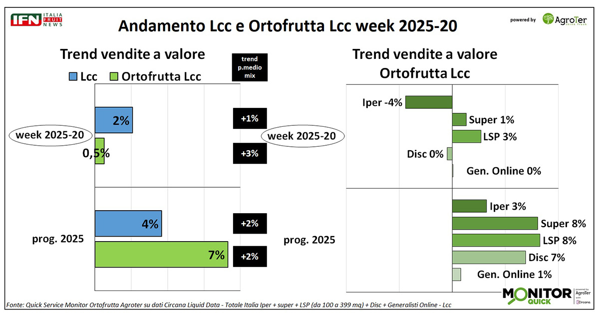 Nella settimana 20, le vendite a valore dell’ortofrutta a peso imposto registrano una crescita lievemente positiva, ma a fronte di un calo nei volumi. Al contrario, l’Lcc mostra una performance più solida. Analizzando i diversi canali distributivi, si osservano difficoltà per ipermercati e discount, mentre supermercati e libero servizio riescono a mantenere una certa stabilità. L’effetto inflattivo osservato è riconducibile principalmente alla frutta, mentre nel comparto verdura si rileva, da alcune settimane, una tendenza al ribasso del prezzo medio mix, particolarmente marcata nelle ultime settimane e per alcune categorie.