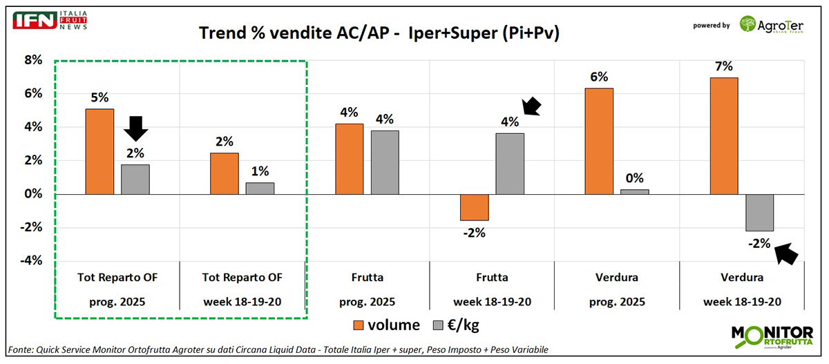 La settimana 20 chiude la metà di maggio con una crescita modesta dell’ortofrutta a peso imposto, che segna un +0,5% a valore, mentre il Largo Consumo Confezionato mostra una crescita leggermente più sostenuta, pari al +2%.