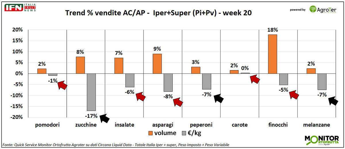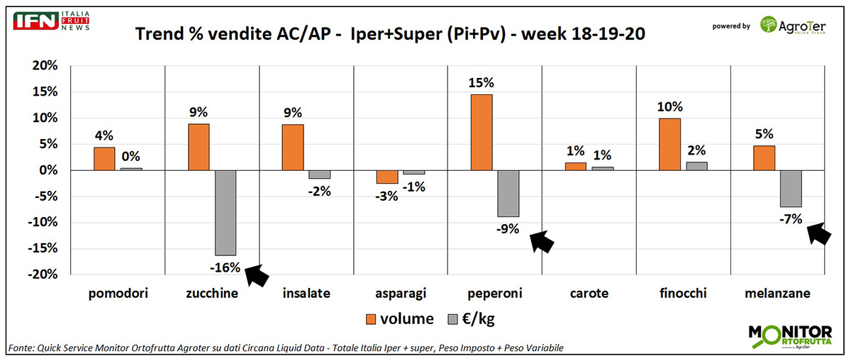 Sul fronte delle vendite, nelle tre settimane analizzate si osserva una certa correlazione tra la variazione del prezzo medio mix e i trend a volume, con la frutta che flette a quantità e la verdura che cresce.