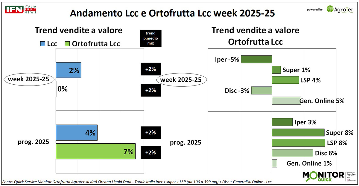 La settimana in esame, a ridosso della fine di giugno, mostra vendite a valore dell’ortofrutta Lcc in linea con il 2024. Tuttavia, l’aumento di 2 punti nel prezzo medio mix indica una flessione dei volumi.
