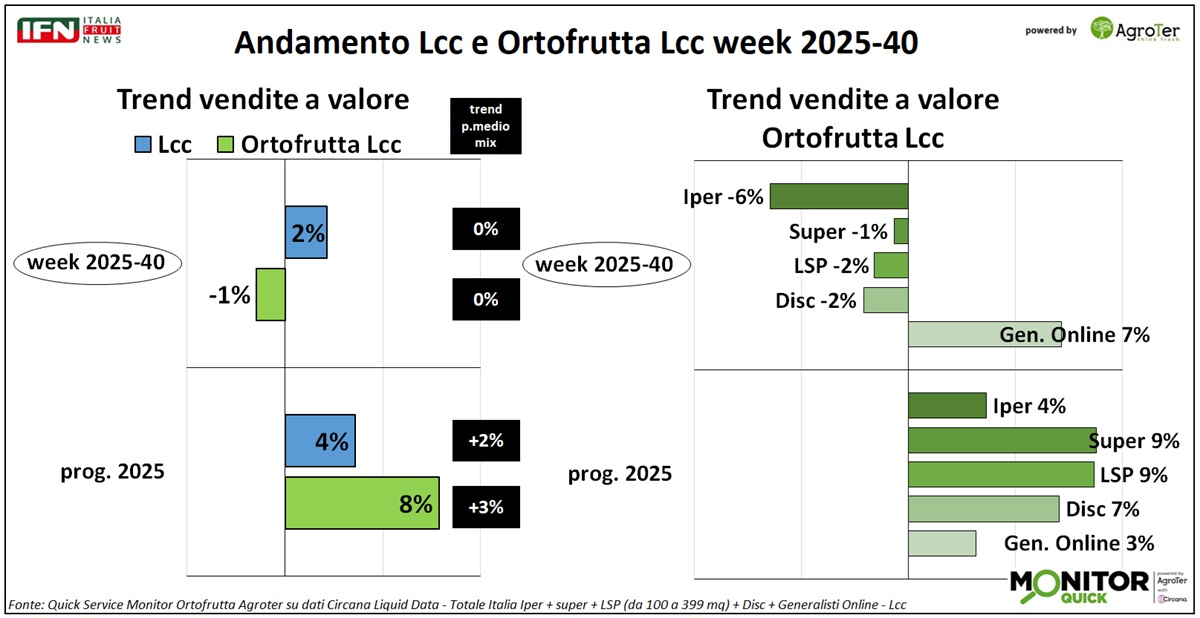 La settimana in analisi, che inaugura il mese di ottobre, registra ancora vendite negative per l’ortofrutta Lcc, con un calo dell’1% sia a valore sia a volume, riflesso di un prezzo medio mix stabile. Si osserva comunque un lieve miglioramento rispetto alle settimane precedenti, quando la contrazione era stata più marcata.