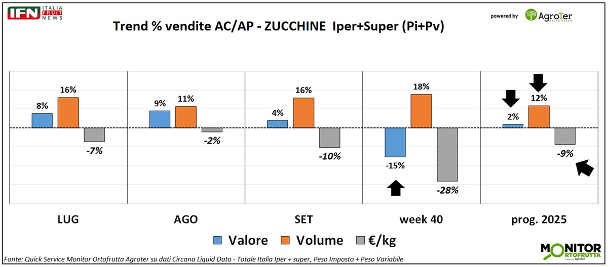 Nel complesso, anche le vendite a valore delle zucchine risultano positive da inizio anno (+2%), grazie a una crescita dei volumi (+12%) che, in termini assoluti, compensa ampiamente la contrazione del prezzo medio mix (-9%). Nella settimana 40, tuttavia, questa dinamica si inverte: il valore registra un calo del 15%, determinato da un forte ribasso dei prezzi al consumo, superiore all’aumento dei volumi, che pur restano in significativa crescita (+18%). (bf)