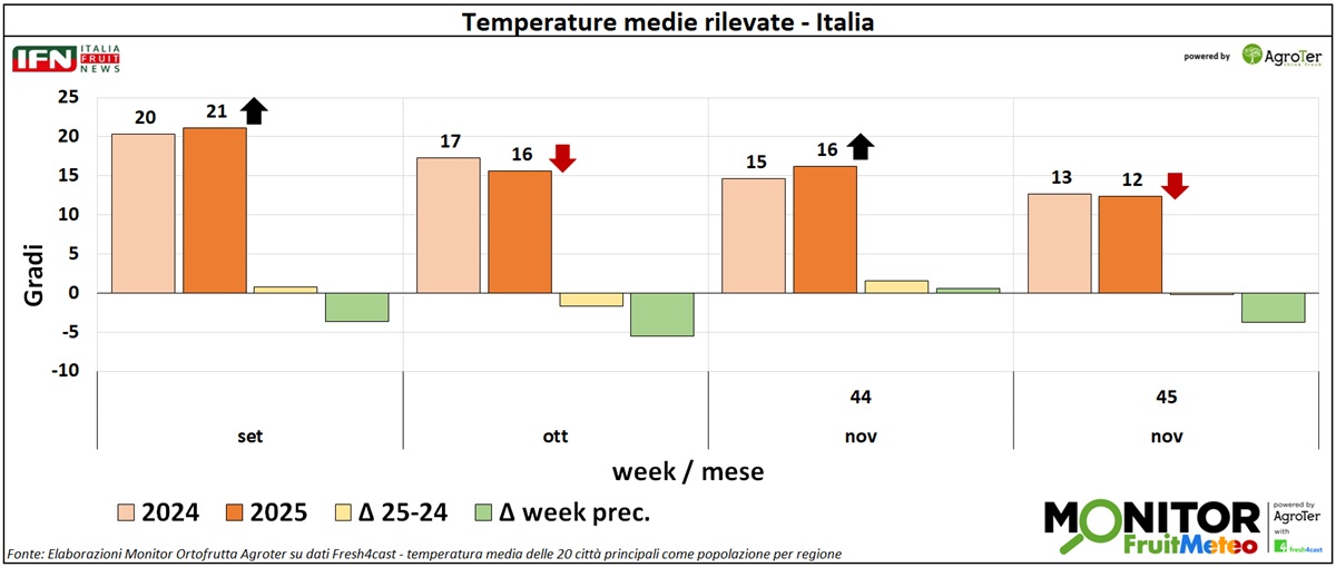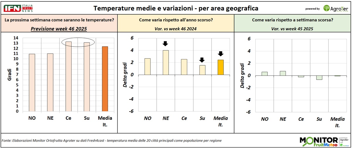 Le analisi del Monitor Ortofrutta si arricchiscono grazie a una nuova collaborazione dedicata a esplorare settimanalmente una variabile spesso decisiva per il settore ortofrutticolo: il meteo. Tra i diversi fattori che influenzano le condizioni climatiche, questa nuova rubrica si concentra in particolare sulle temperature medie registrate lungo la Penisola, con il supporto di Fresh4cast, una piattaforma software in cloud specializzata nella previsione della domanda e nell'ottimizzazione della supply chain per il settore ortofrutticolo.