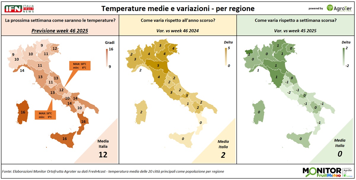 La settimana in corso si manterrà su una media di 12°C, in linea con la precedente, ma con una variazione positiva di oltre 2°C medi rispetto al 2024, un riscaldamento più marcato nel Nord-Est e più contenuto nelle regioni meridionali. Il divario termico tra le aree più settentrionali e quelle più meridionali sarà di circa 7°C, mentre in due regioni del Centro l’escursione tra le temperature massime e minime raggiungerà i 10°C. Questi sono i principali risultati delle analisi del Monitor Ortofrutta, realizzate in collaborazione con Fresh4cast.