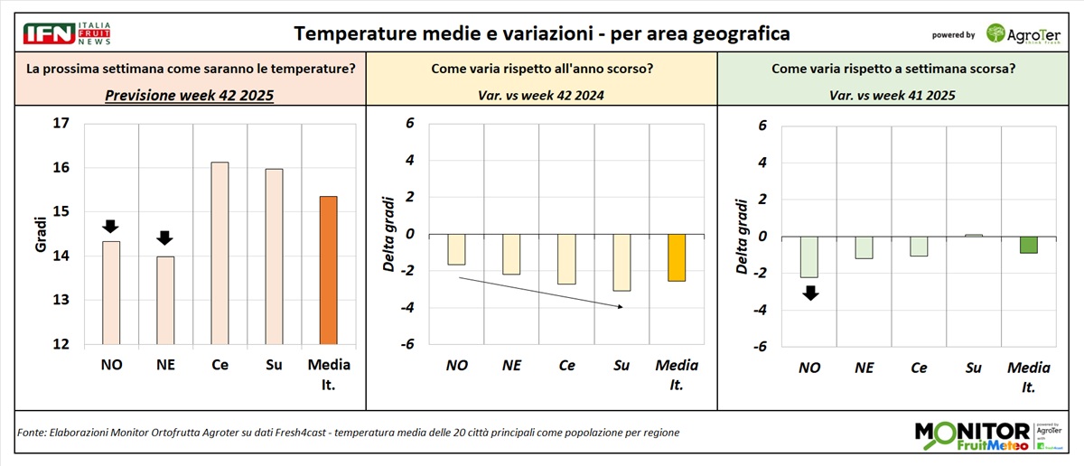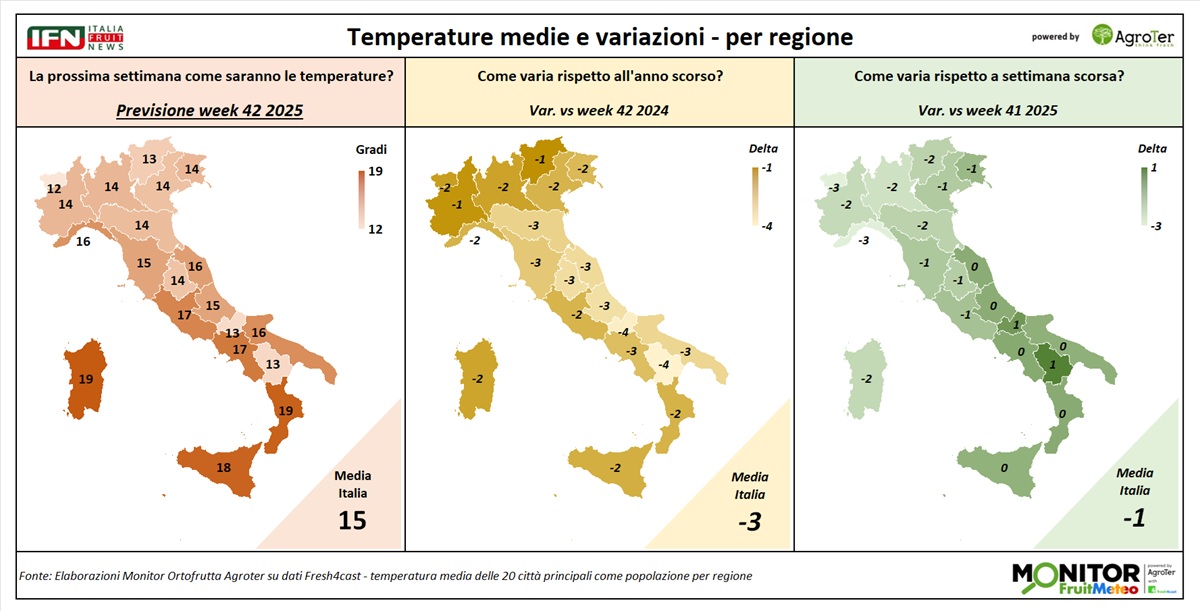 Le analisi del Monitor Ortofrutta si arricchiscono grazie a una nuova collaborazione dedicata a esplorare settimanalmente una variabile spesso decisiva per il settore ortofrutticolo: il meteo. Tra i diversi fattori che influenzano le condizioni climatiche, questa nuova rubrica si concentra in particolare sulle temperature medie registrate lungo la Penisola, con il supporto di Fresh4cast, una piattaforma software in cloud specializzata nella previsione della domanda e nell'ottimizzazione della supply chain per il settore ortofrutticolo.