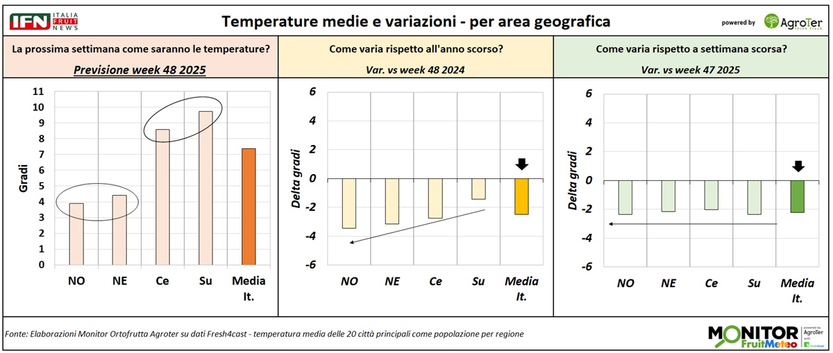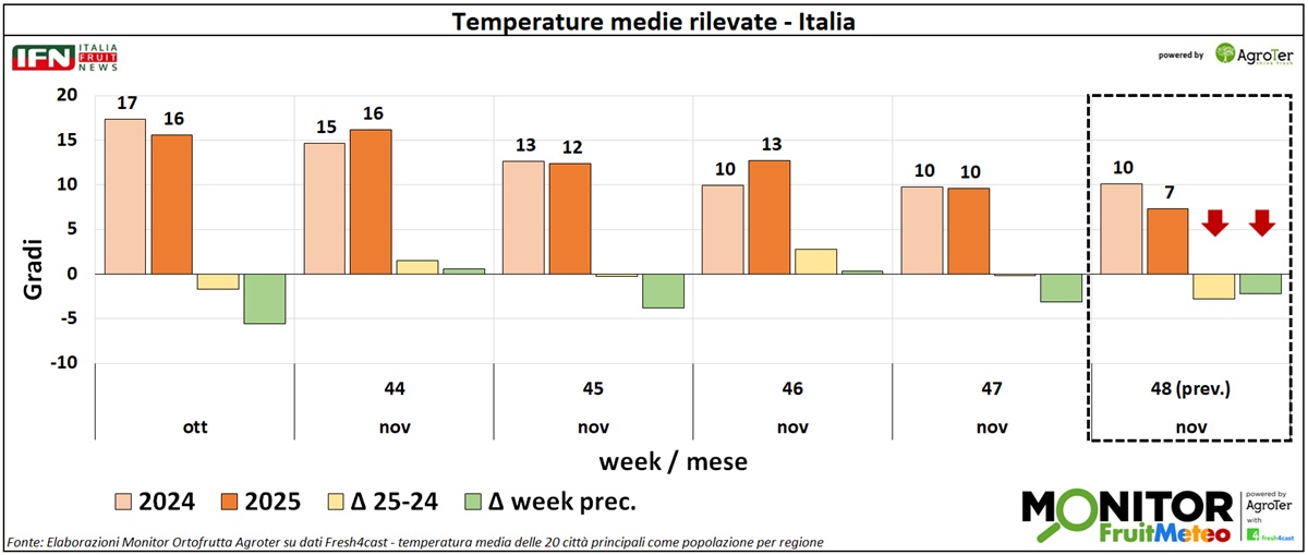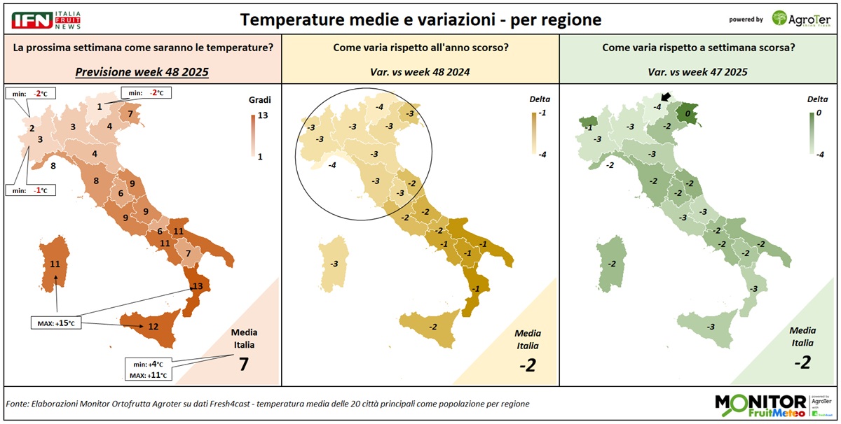 Nel giro di due settimane le temperature medie lungo la penisola registreranno un calo di 6 °C, accompagnato da un netto raffreddamento rispetto al 2024 anche dai prossimi giorni. Il divario tra Nord e Sud resterà marcato, con alcune eccezioni regionali sia nelle medie sia nelle temperature massime e minime. Durante questa settimana, la giornata più mite sarà domani, mentre mercoledì e giovedì si raggiungeranno i valori più bassi. Questi sono i principali risultati delle analisi del Monitor Ortofrutta, realizzate in collaborazione con Fresh4cast.