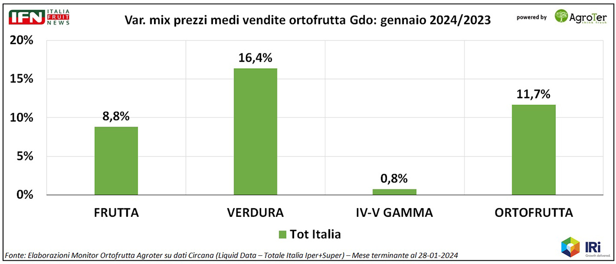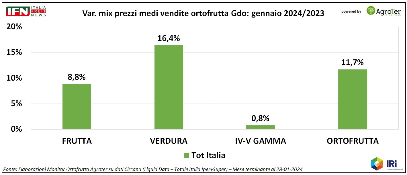 La verdura, per esempio, evidenzia una crescita dei prezzi medi vicina ai 17 punti, mentre per IV-V Gamma l’inflazione è veramente minima (+0,8%) e in flessione rispetto al totale 2023 (+3,2%), fatto che innesca un ulteriore campanello d’allarme sullo stato di salute del comparto.(gc)