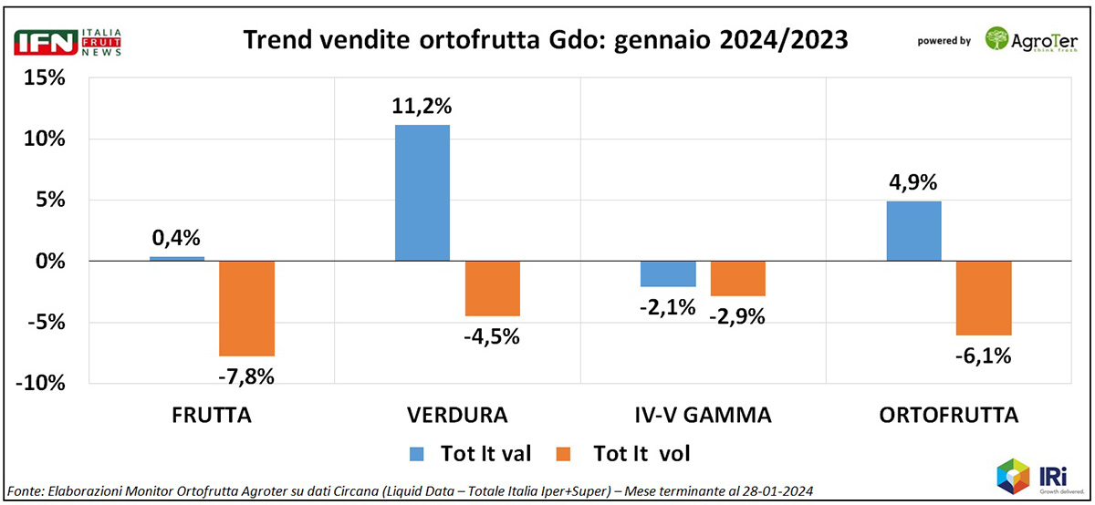 Il 2024 non si apre nel migliore dei modi per il reparto ortofrutta della Gdo. I volumi sono in netta flessione e l’inflazione aumenta di quasi 4 punti rispetto alla chiusura del 2023. A livello di macrocategorie, la frutta è più di tutte responsabile della debacle, mentre per la verdura si evidenzia un aumento dei prezzi nettamente superiore alla media. In tutto ciò, i prodotti servizio viaggiano un po' in controtendenza, con una perdita limitata nelle vendite e un’inflazione quasi nulla.