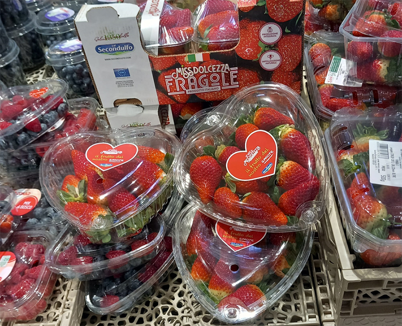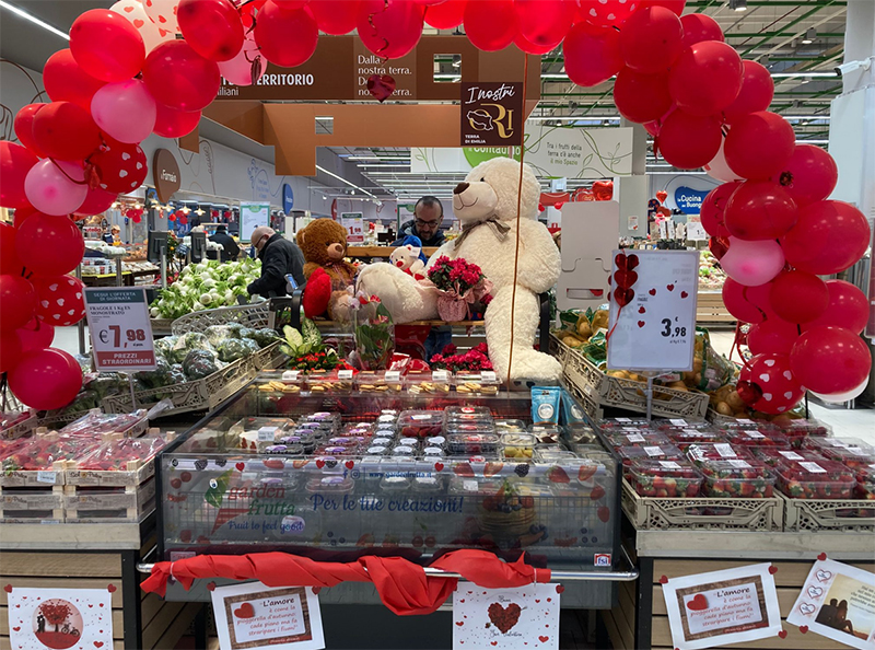 Oggi è San Valentino, la festa degli innamorati e anche il settore ortofrutticolo coglie l'occasione per celebrare questo evento. Lo dimostrano gli allestimenti a tema che abbiamo osservato in diverse catene della Grande distribuzione organizzata negli ultimi giorni. Tra scenografie più o meno appariscenti, spicca un protagonista indiscusso: la fragola. Del resto, quale frutto meglio di questo può simboleggiare l’amore? Il suo colore rosso intenso, la forma che ricorda un cuore e il sapore avvolgente la rendono perfetta per l’occasione.