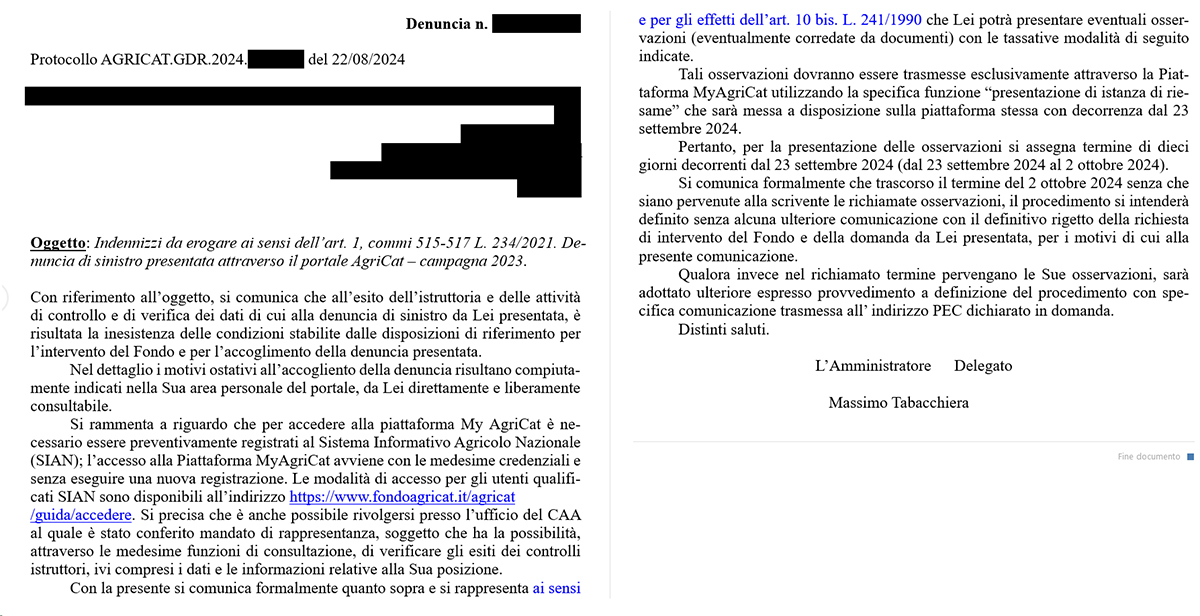Quella che trovate in allegato è la lettera spedita dal Fondo Agricat, pochi giorni fa, a diverse migliaia di agricoltori italiani, in particolare emiliano romagnoli, ma anche lombardi, marchigiani e toscani, dove si comunica che le loro domande di indennizzo per i danni subiti a causa delle gelate tardive e dell'alluvione del 2023 sono state respinte del tutto o in parte. In questo caso, la richiesta è stata totalmente respinta, poiché “è risultata la inesistenza delle condizioni stabilite dalle disposizioni di riferimento per l’intervento del Fondo e per l’accoglimento della denuncia presentata. Nel dettaglio i motivi ostativi all’accogliento della denuncia risultano compiutamente indicati nella Sua area personale del portale, da Lei direttamente e liberamente consultabile”. Il documento procede spiegando come accedere alla pagina personale, oltre a specificare i termini per presentare eventuali osservazioni, ovvero, un lasso di tempo di 10 giorni, più precisamente dal 23 settembre al 2 ottobre. Parole che pesano come un macigno, se pensiamo a quelle aziende che in pochi istanti hanno perso praticamente tutto, e che speravano nei ristori per coprire almeno una parte dei debiti sostenuti per cercare di riprendere l’attività. Invece, la situazione sta assumendo dei tratti a dir poco grotteschi, sotto ogni punto di vista.