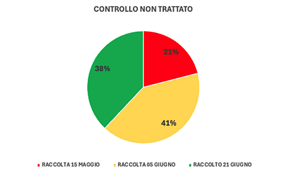 “Questo consente di modulare e ottimizzare la risposta metabolica delle piante, promuovendo la maturazione e facilitando una colorazione più intensa e uniforme, massimizzando così la qualità e la resa dei frutti, come dimostra una prova svolta in Cile, dove emerge una concentrazione della raccolta, nella tesi trattata con PHARMAMIN-M fra primo e secondo stacco, a differenza del testimone non trattato”.
