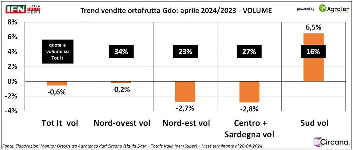 Il primo mese completamente primaverile non giova alle vendite del reparto ortofrutta della Gdo. Ad aprile, infatti, i volumi sono in flessione, ma ciò è legato - soprattutto - alla performance delle verdure, negative nonostante una flessione dei prezzi medi, così come quelle della IV-V Gamma. Nelle quattro aree geografiche si notano ancora marcate differenze. Da una parte l’andamento del Sud, positivo rispetto al resto della Penisola, che - viceversa – si trova in perdita. A livello di prezzi medi si rileva un trend in controtendenza solo nel Centro.