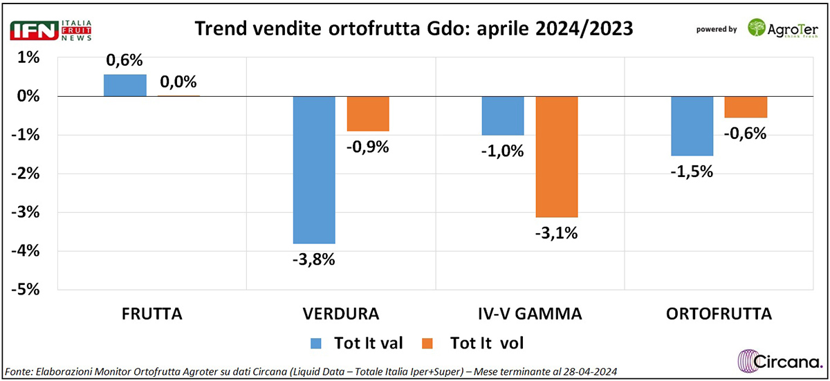 Aprile si chiude con un -0,6% nelle vendite a volume per il reparto ortofrutta di ipermercati e supermercati della Gdo italiana. Il risultato complessivo, però, è figlio di un pareggio nei quantitativi rispetto al 2023 per la frutta, una flessione nelle verdure (-0,9%) e, soprattutto, una perdita di 3,1 punti nella IV-V Gamma, anche se quest’ultima influisce relativamente sui consumi complessivi del reparto.
