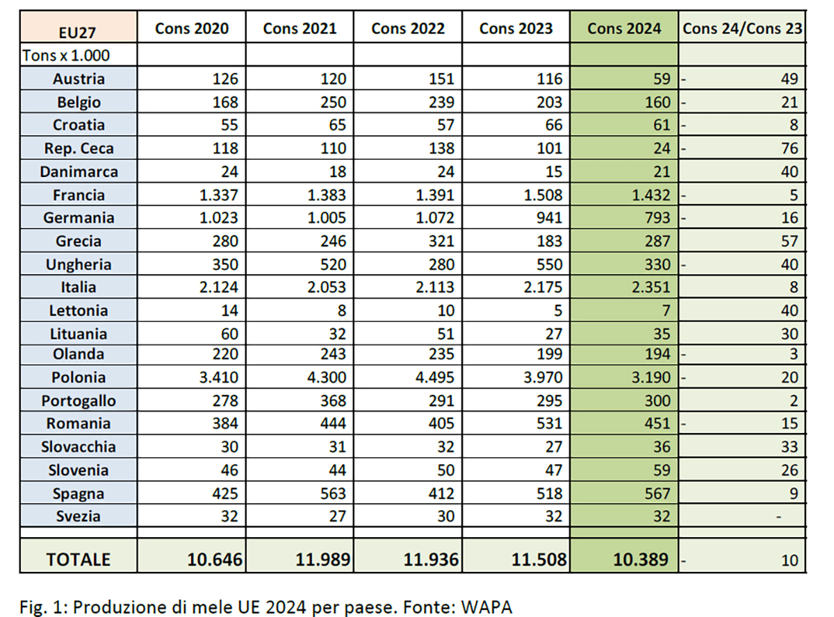 Le notizie che arrivano da WAPA per la produzione UE sono buone per il comparto italiano. La produzione totale per i paesi produttori europei è confermata in calo di -10% rispetto al 2023, arrivando a 10.389.000 tonnellate (Fig. 1), e di conseguenza ci saranno più possibilità per posizionare le mele italiane dove invece si conferma un consuntivo in aumento dell’8%.