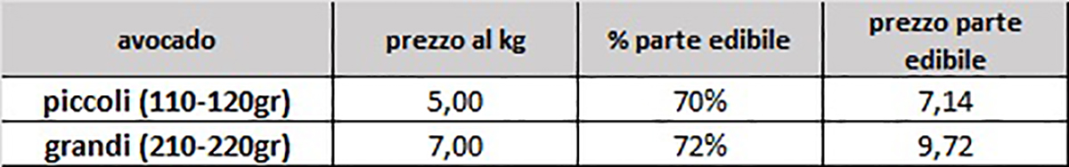 Ragionando sulla parte edibile, invece, l’avocado grande si avvicina ai 10 euro al chilo, il piccolo supera di poco i 7. Per cui, tutto sommato, l'avocado piccolo ha un prezzo sensibilmente inferiore rispetto a quello grande, soprattutto se si ragiona sul singolo frutto (il piccolo costa poco meno di un terzo, ma offre una quantità di polpa superiore alla metà del grande).