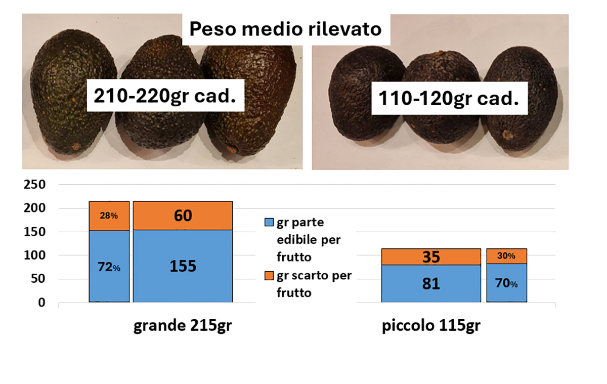 Abbiamo acquistato una rete da sei frutti e sei frutti sfusi, maturandoli al punto giusto. Dopo averli pesati, abbiamo escluso lo scarto per calcolare il peso netto. Dalle banche dati istituzionali, viene evidenziato che per l’avocado la quota di parte edibile è intorno al 75-76%. Nella nostra prova empirica la quota è risultata un po' più bassa e leggermente superiore nei frutti grandi (72%), rispetto a quelli piccoli (70%). Quindi, ogni avocado di calibro maggiore offre oltre 150 grammi di parte edibile, mentre quello più piccolo ne fornisce poco più di 80.