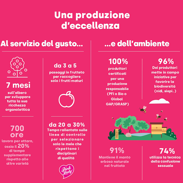 “Coltivare Pink Lady è una sfida: per produrla serve in media il 20% di ore lavoro in più rispetto alla media delle mele. Un impegno che però è ripagato dalle quotazioni e dalla soddisfazione di far gustare alle persone una vera eccellenza”, spiega Giuliano Donati, produttore romagnolo della zona di Faenza.