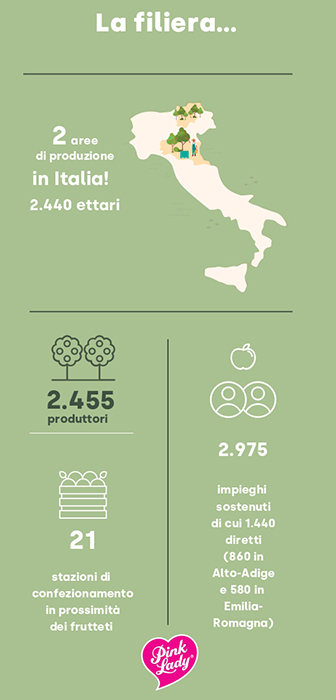I numeri della mela rosa sono imponenti: l'associazione Pink Lady Europe, con sede a Le Pontet in Francia, riunisce 10 vivaisti, 3.145 produttori per una superficie totale di 5.300 ettari e oltre 10.000 addetti in Italia, Francia e Spagna. Il nostro paese fa la parte del leone, con oltre 90.000 tonnellate prodotte e 2.455 produttori.