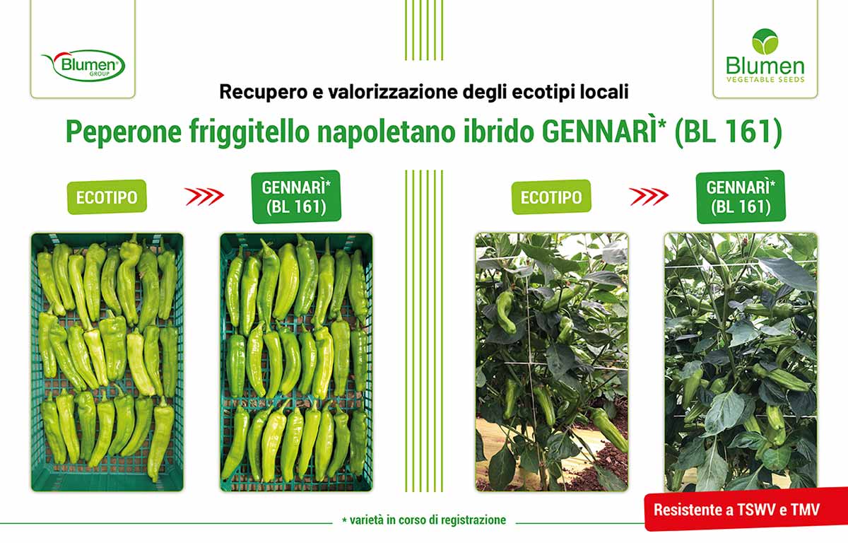 Valorizzare gli ecotipi locali è da sempre un obiettivo della casa sementiera Blumen Vegetables Seeds (clicca qui per approfondire ). Questa volta la ricerca dell'azienda, nella figura del breeder Mariano Giannone, si è rivolta al segmento peperoni, per cui è stato innovato l’ecotipo locale del friggitello napoletano. L’ibrido ottenuto (BL 161 che prenderà il nome di Gennarì) mantiene le stesse caratteristiche dell’ecotipo, cioè la tipica forma del frutto con terminazione a tre punte, la dimensione e lo spessore. Rispetto all’ecotipo originale, però, la nuova selezione è più uniforme, con buccia liscia e sottile, più produttiva e resistente alle principali fitopatie, oltre a presentare una maggiore facilità di allegagione. Ci ha introdotto alla conoscenza dell’ortaggio Rocco Parisella, responsabile sviluppo prodotto per Blumen Vegetable Seeds.
