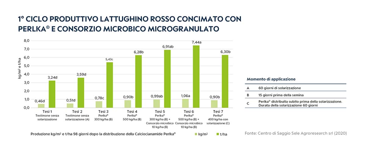 L'utilizzo di calciocianamide Perlka® su colture di quarta gamma, utilizzata in strategia con diversi microrganismi e applicata prima della semina, ha mostrato di migliorare la resa e la qualità della produzione rispetto sia al non trattato, che alle tesi trattate solo con Perlka® o solo con microrganismi. In modo particolare, oltre ai benefici conseguibili con l'uso della calciocianamide, è emersa la sinergia tra Perlka® e microrganismi con interessanti effetti anche sui cicli colturali successivi.