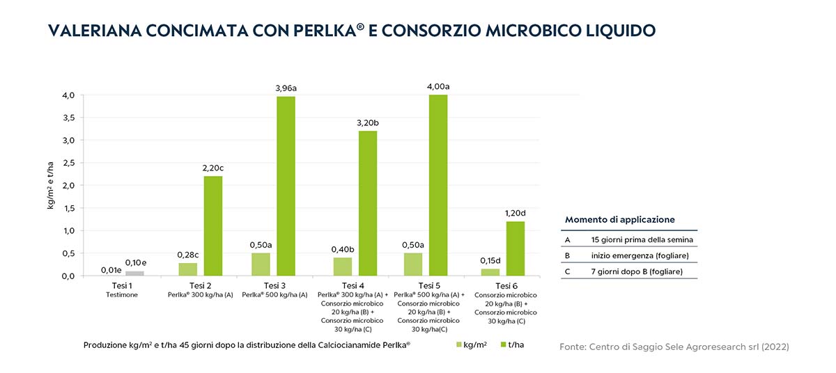 Calciocianamide Perlka®, utilizzata da sola o in strategia con consorzi microbici e applicata prima della semina, migliora la resa e la qualità della produzione. Nei grafici precedenti abbiamo riportato i risultati produttivi di 2 prove su valeriana e rucola con consorzio microbico liquido e una prova su lattughino con consorzio microbico microgranulato.