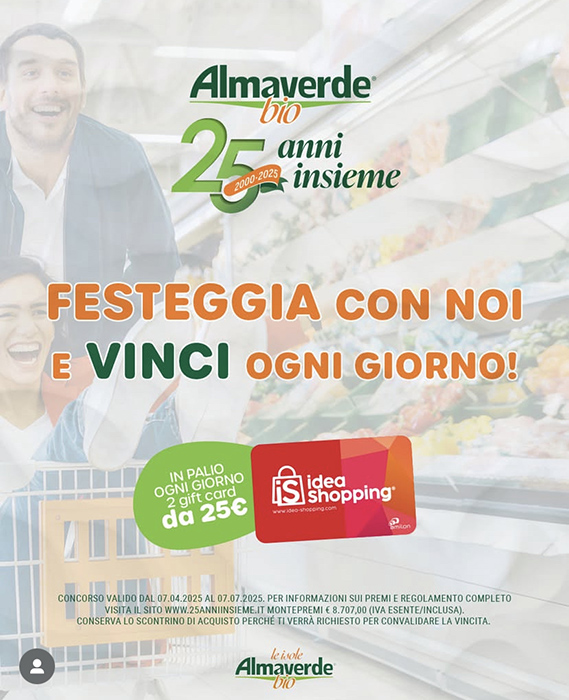 Dal 7 aprile al 7 luglio 2025, nelle Isole Almaverde Bio ogni 10 euro di spesa in prodotti a marchio danno diritto a partecipare all’estrazione immediata di una gift card da 25 euro, utilizzabile nel portale di acquisti Idea Shopping. Ma non finisce qui: tutti i partecipanti potranno concorrere anche all’estrazione finale di un premio esclusivo, (3 Iphone 16) pensato per celebrare nel modo più coinvolgente i 25 anni del brand.