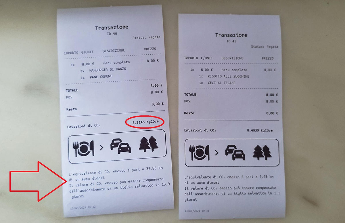 Due scontrini di un pasto affiancati, uno a base di carne e uno vegetariano, apparentemente molto simili. Se non fosse per la loro indicazione sulle emissioni di anidride carbonica: il pasto di carne arriva a 5.3145 Kg emessi, quello vegetariano a 0.4039 chilogrammi emessi. Al di là delle preferenze alimentari e delle scelte etiche che dipendono da ognuno di noi, è spontaneo il ragionamento che ne sorge. Un ragionamento che va al di là della scelta fatta sul momento e che impone una riflessione sulla direzione da intraprendere a lungo termine. A iniziarla è Claudio Dall’Agata, direttore del consorzio Bestack, nel suo articolo “Ognuno la sua responsabilità, subito!” (clicca qui per leggerlo).