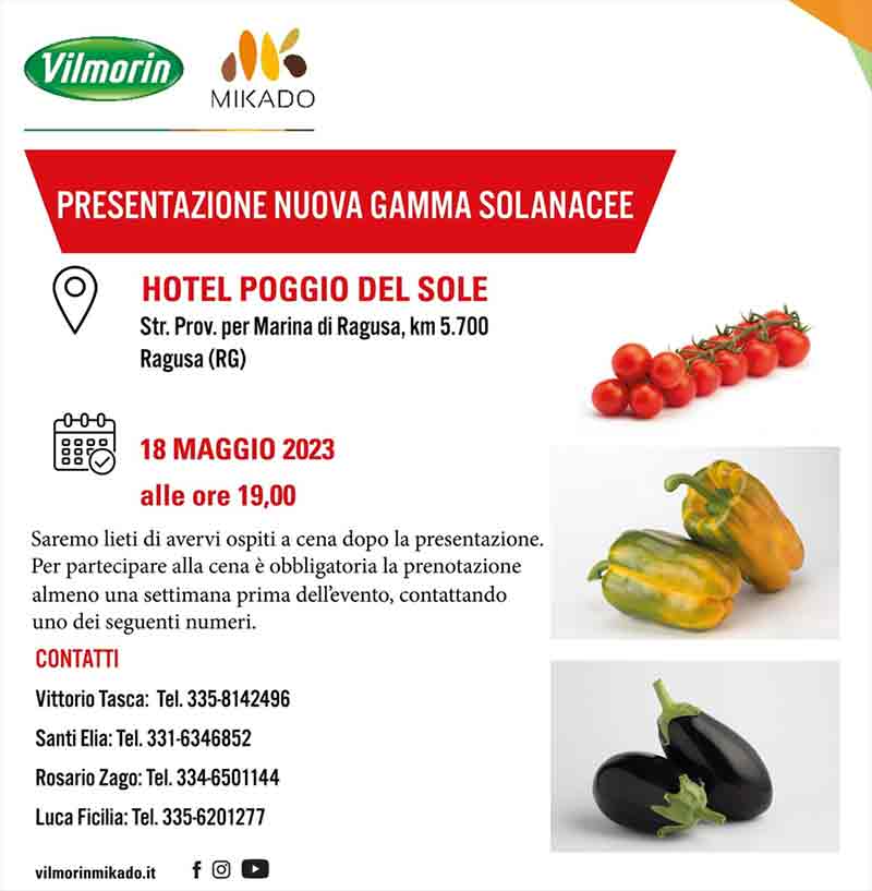Oggi Vilmorin-Mikado presenterà la nuova gamma di solanacee. Tutti i dettagli dell'evento sono riportati nella locandina sopra.