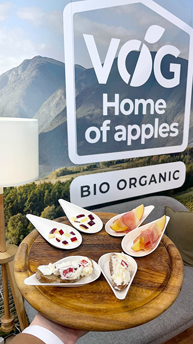 L’assortimento biologico di VOG offre infatti una grande varietà di aromi, sapori e consistenze che la mela può avere. Per valorizzare la molteplicità delle caratteristiche sensoriali delle mele bio, sullo stand di Biofach il Consorzio, con il supporto di un sommelier della mela, ha proposto diversi abbinamenti con eccellenze gastronomiche biologiche del territorio altoatesino: le diverse varietà di mela sono state abbinate al tipico pane di segale, allo yogurt e allo speck. Attraverso abbinamenti, proposte di nuovi modi di consumo e innovazione varietale e di brand, VOG propone nuovi approcci di comunicazione - emozionali ma concreti - per raggiungere i consumatori e fare crescere il segmento biologico.
