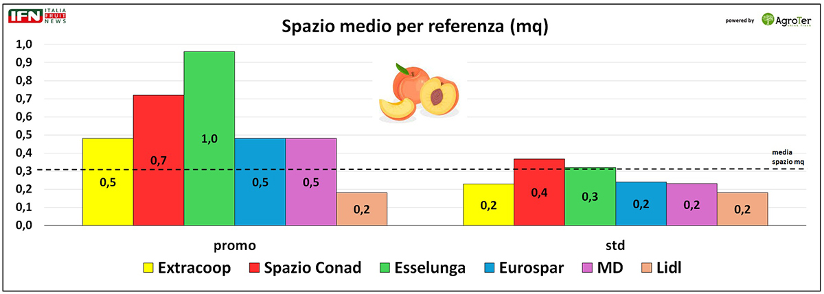 Tuttavia, lo spazio medio per referenza risulta leggermente inferiore a meloni e ciliegie. Questo perché, a differenza di queste due categorie, l’assortimento di pesche e nettarine è più ampio, il che porta a evitare una sovraesposizione delle singole prestazioni.