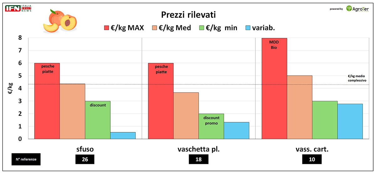 Le vaschette in plastica risultano le più convenienti, con un picco massimo di 6 €/kg per una referenza di pesche piatte, e il prezzo minimo registrato in un discount. Al contrario, i vassoi in cartone mostrano i livelli più alti: una Mdd biologica raggiunge il massimo rilevato di 8 €/kg. Lo sfuso – che ricordiamo avere una quasi totalità di calibro A - si colloca in una fascia intermedia, con le pesche piatte ancora una volta a segnare il prezzo più alto, e il valore più basso sempre rilevato nei discount.