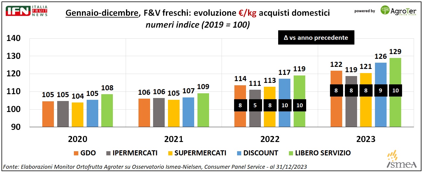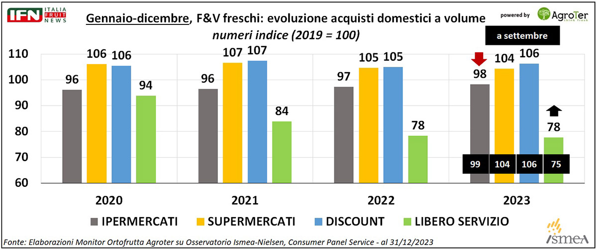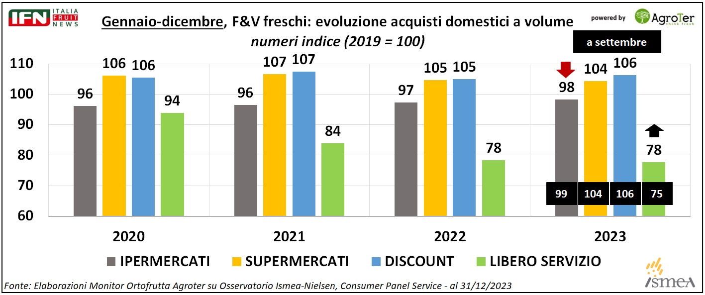 Parimenti, discount e supermercato si giocano la crescita, con un continuo testa a testa nei diversi anni e un 2023 che vede il discount crescere di un punto rispetto al 2022 (da 105 a 106), e il supermercato flettere di uno (da 105 a 104).