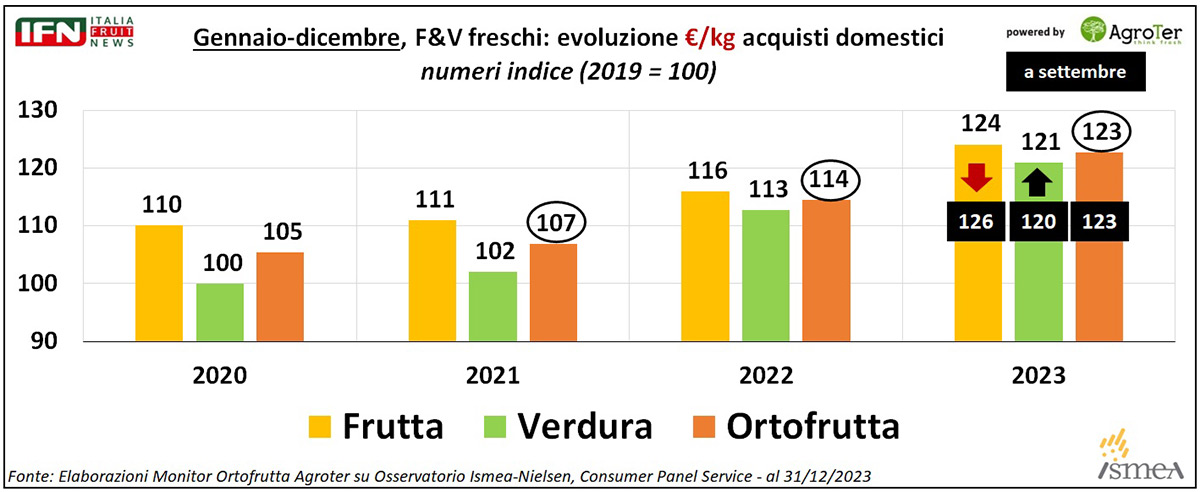 Sul fronte dei prezzi medi, il 2023 si conferma un anno con forti effetti inflattivi pari, però, a livello di crescita, a quelli registrati nel 2022: +7 punti per l’ortofrutta tra 2021 e 2022, ed altri 7 punti tra 2022 e 2023, con una piccola variazione registrata in corso d’anno tra la frutta (che rallenta come inflazione rispetto a settembre) e la verdura (che aumenta i prezzi medi).