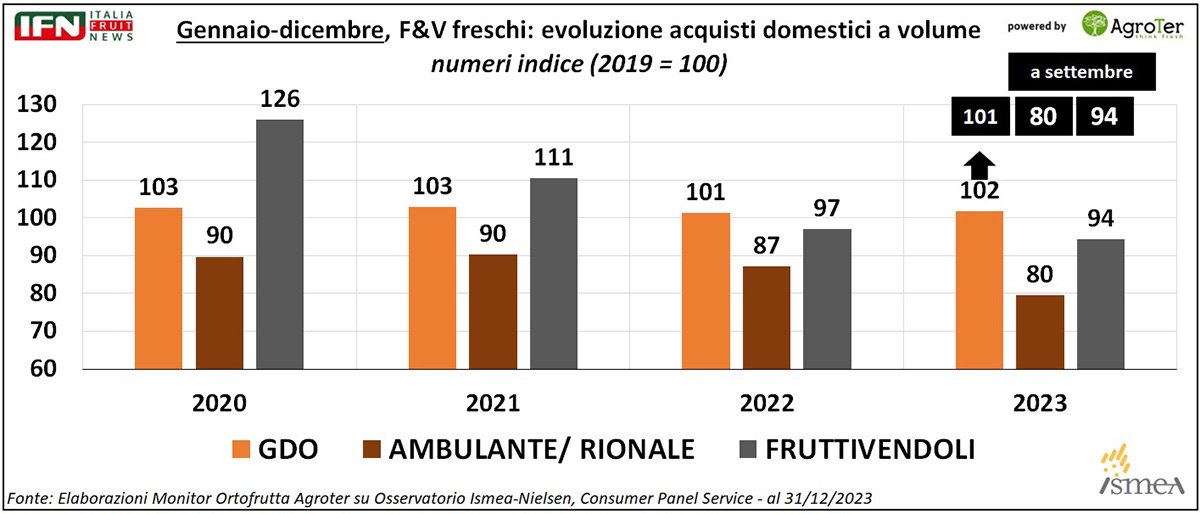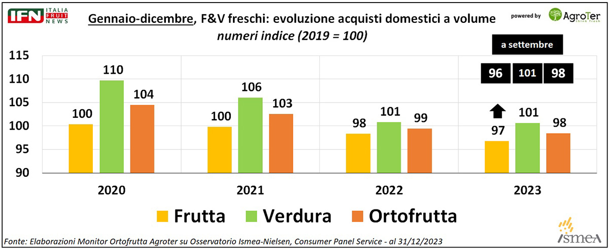 Grazie alle analisi del Monitor Ortofrutta di Agroter in partnership con Ismea-Nielsen, continua il monitoraggio della serie storica per gli acquisti domestici delle famiglie italiane per frutta e verdura fresca, con il consuntivo per l’anno appena concluso. Rispetto al 2019 (che consideriamo come base di partenza e poniamo pari a 100 come valore di riferimento), i consumi di ortofrutta mostrano prima una risalita, dovuta alla pandemia (104 nel 2020), poi un lento e continuo ridimensionamento, più netto nel 2022 (99) e ulteriormente amplificato nel 2023 (98). Nell’ultimo anno analizzato, si osserva un leggero miglioramento per la frutta in coda d’anno, rispetto all’analisi svolta a settembre, ma un sostanziale stallo dei volumi per la verdura.
