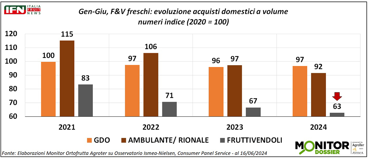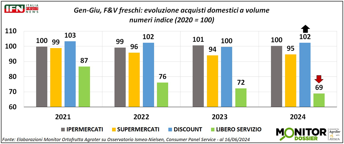All’interno della Gdo, poi, c’è un canale che mostra più o meno le medesime difficoltà del fruttivendolo, ovvero il libero servizio, che flette di 31 punti dal 2020. Parimenti, il discount continua a crescere (+2%), mentre l’ipermercato tiene e il supermercato arranca (-5%) anche se in crescita rispetto al 2023.