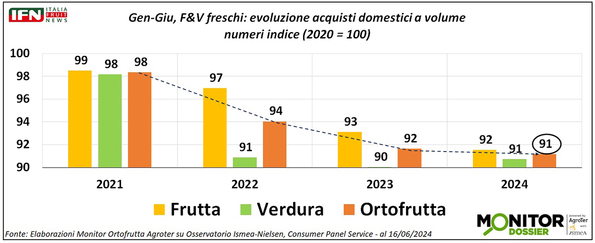Nei primi sei mesi dell’anno, dal 2020 al 2024, il dato più eclatante è certamente la perdita dei consumi domestici complessivi di ortofrutta che, nel giro di cinque anni, si riduce di 9 punti (indice base 100 rispetto al 2020 pari a 91 nel 2024). La spezzata cola a picco tra il 2021 (anno ancora pesantemente coinvolto nella pandemia) e il 2022, poi l’intensità della flessione diminuisce nel 2023 e nel 2024, ma il calo degli acquisti a quantità è una costante. Difatti, il saldo è pesante e lo è un po’ di più nella verdura, considerando il medio-lungo periodo, anche se rispetto al 2023 si registra una lieve crescita per questa macrocategoria nell'anno in corso.