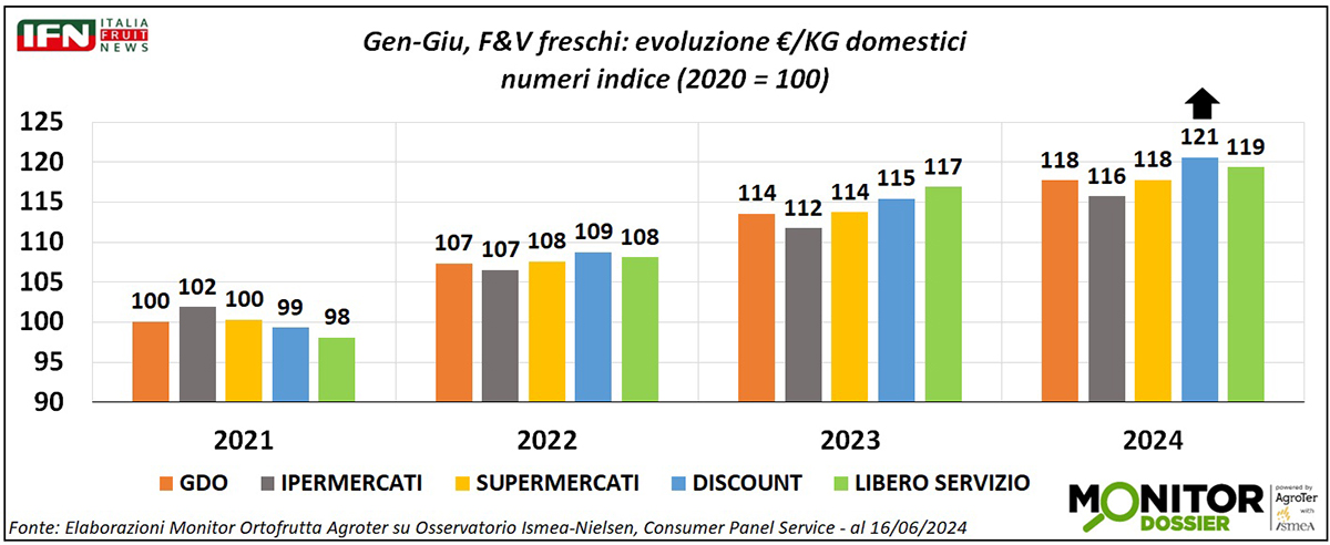La crescita del discount è ancora più interessante se si osserva l’evoluzione del prezzo medio mix, che risulta maggiormente in crescita in questo canale rispetto al resto della Gdo, se si osservano 2023 e 2024. Tuttavia, in un contesto inflattivo (anche se in ridimensionamento nella seconda parte del 2024), il differenziale nei prezzi al pubblico tra supermercato e discount è ancora evidente e spinge ancora di più i clienti a direzionarsi verso questo canale anche negli acquisti di ortofrutta.