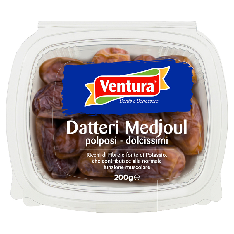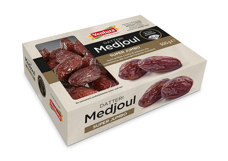 Ventura si conferma leader del segmento di mercato, grazie ad un mix assortimentale ampio e profondo: da un lato un’attenta selezione all’origine della varietà Deglet Nour della Tunisia, molto apprezzata dai consumatori anche nella versione ramata; dall’altro un’accurata ricerca dei migliori datteri Medjoul, morbidi e polposissimi, dal sapore intenso e ricco, tutti al naturale.