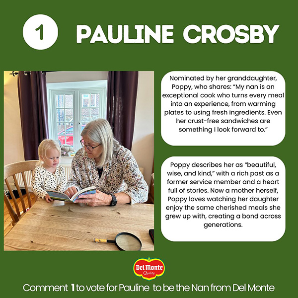 Pauline Crosby, 74 anni, (nella foto in apertura, fonte: Facebook) originaria del Norfolk, nel Regno Unito, è stata scelta come prima "The Nan from Del Monte" (La nonna Del Monte, ndr), diventando il volto della campagna marketing 2025 dello storico marchio di frutta in scatola, come riporta fruitnet.com.