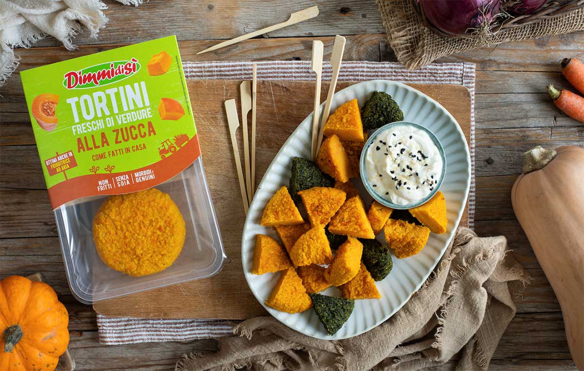 Tre le ricette della gamma, ognuna con una verdura protagonista: Tortini di Spinaci, di Zucca e di Broccoli. Tre ortaggi molto amati e utilizzati nelle cucine italiane. La texture del tortino risulta particolarmente piacevole al palato, il gusto è ricco e l’aspetto colorato e vivace.