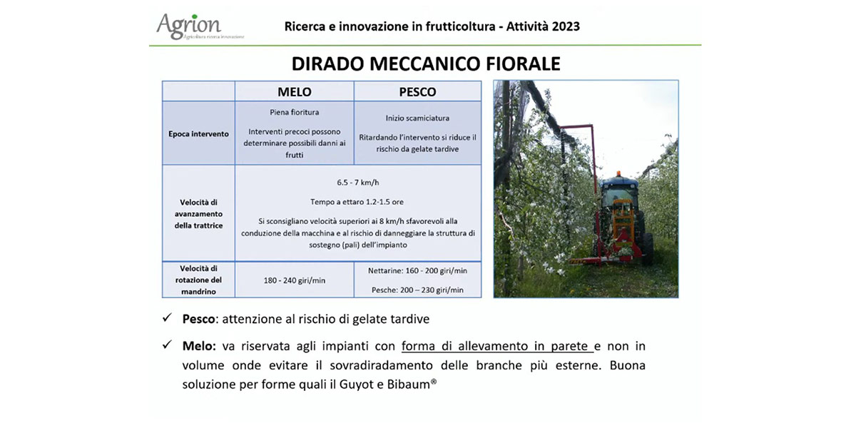 “In alternativa al diradamento chimico c’è quello meccanico (con 'spazzola rotante' che sfoltisce i fiori) per il quale sono state fatte innumerevoli prove, ed è chiaro come il primo fattore limitante sia la forma d’allevamento: in parete il risultato è buono, diversamente si rischia di ‘spazzolare’ solo le branche più esterne. Su pesco i risultati sono stati positivi, solo che negli ultimi anni il rischio gelate ne ha pregiudicato l’utilizzo. Chiaramente il diradamento manuale resta l’ultima spiaggia, da adottare solo se in precedenza non siamo riusciti ad arrivare al carico produttivo ideale (circa 90-100 frutti per pianta)”.