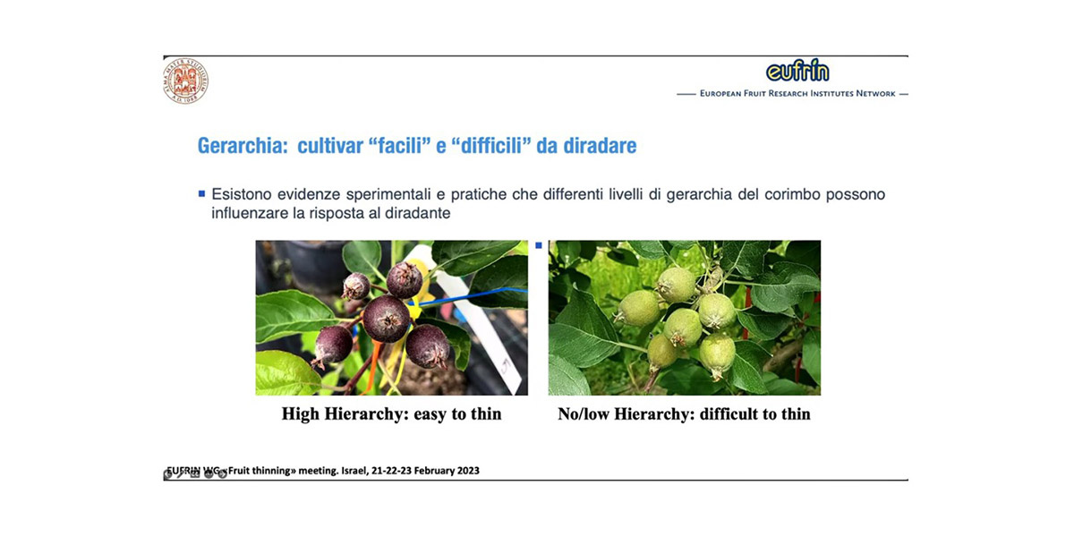 La parola è poi passata al Prof. Guglielmo Costa dell’Università di Bologna, ritenuto fra i massimi esperti in materia: “Nel melo l’efficacia dei diradanti chimici è favorita dalla gerarchia fiorale. Infatti, all’interno del corimbo, c’è un fiore centrale (king flower) che domina sui laterali che sono maggiormente colpiti dall’azione della sostanza diradante o dalle diverse cascole naturali. Il problema è quando i laterali hanno lo stesso sviluppo del centrale e questo determina se una varietà si presta o meno al diradamento chimico. È evidente che le nuove varietà vanno studiate anche sotto questo aspetto".