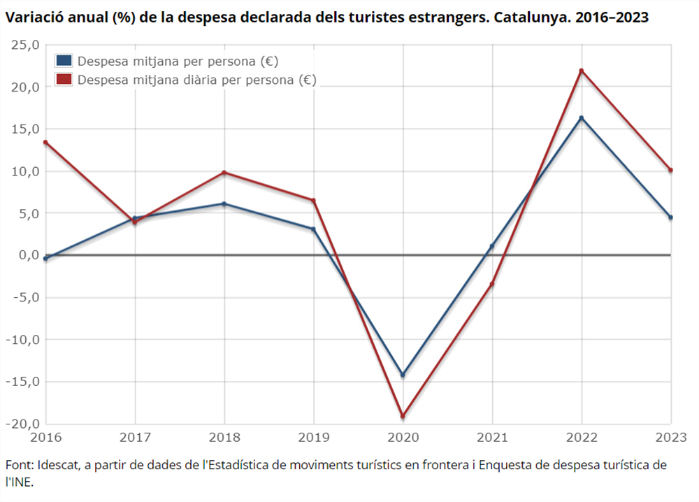 Infatti, secondo i dati provvisori di idescat.cat, del 2023, la spesa totale dei turisti residenti all'estero con destinazione principale Catalogna è aumentata del 26,7% e vale quasi 21 miliardi di euro. La spesa media giornaliera pro-capite è stata invece di 207 euro, con un aumento del 10,1% rispetto all'anno 2022.