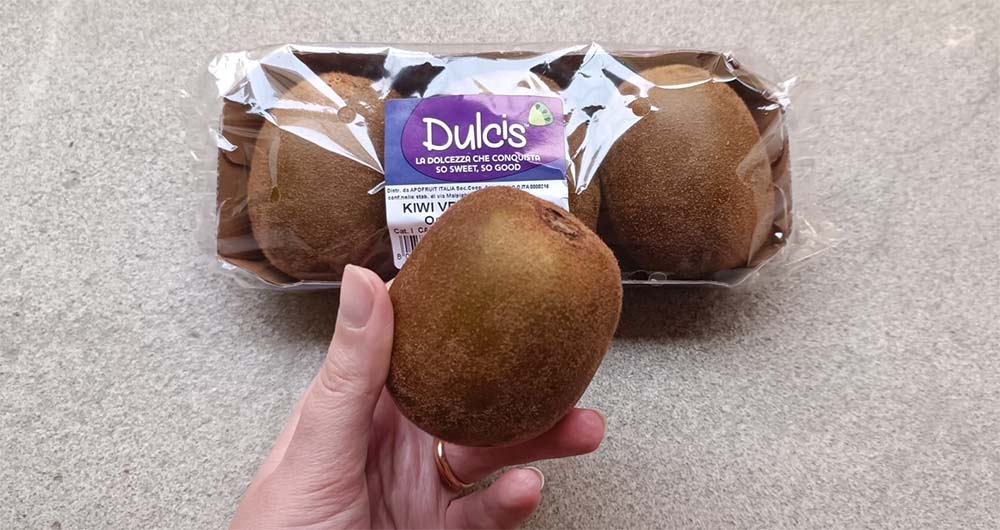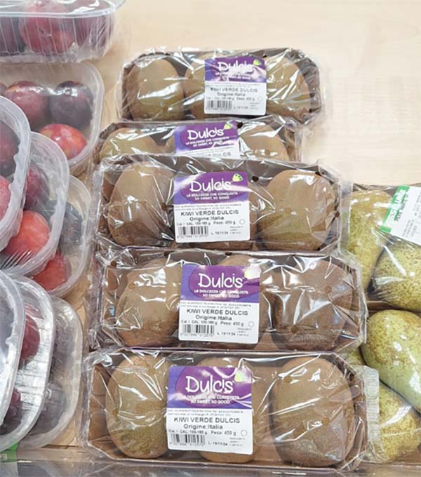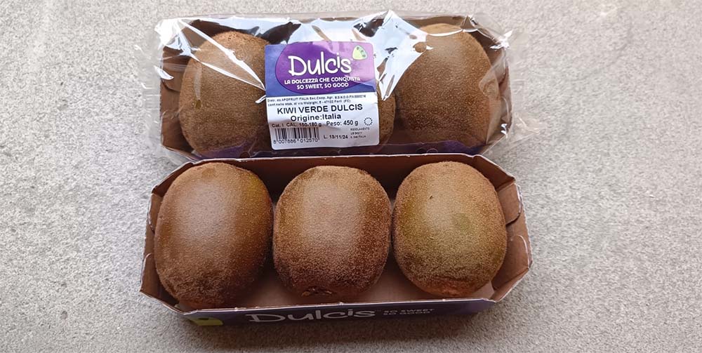 Per capire effettivamente le potenzialità di Dulcis™ verso il grande pubblico, ci siamo messi nei panni di un qualsiasi consumatore e abbiamo acquistato alcuni frutti nei banchi di un supermercato. Per essere precisi eravamo in un punto vendita Esselunga a Bologna, dove abbiamo trovato Dulcis, all’interno dello spazio dedicato al kiwi, venduto confezionato in vassoi di cartone filmati da 3 frutti, per un peso egalizzato di 450 grammi. Il prezzo di vendita era di 2,85 euro a confezione, pari a 6,34 euro al chilo, che posiziona Dulcis a metà strada fra un kiwi verde di buona qualità e una varietà a polpa gialla, in linea con gli obiettivi della compagine che lo produce.