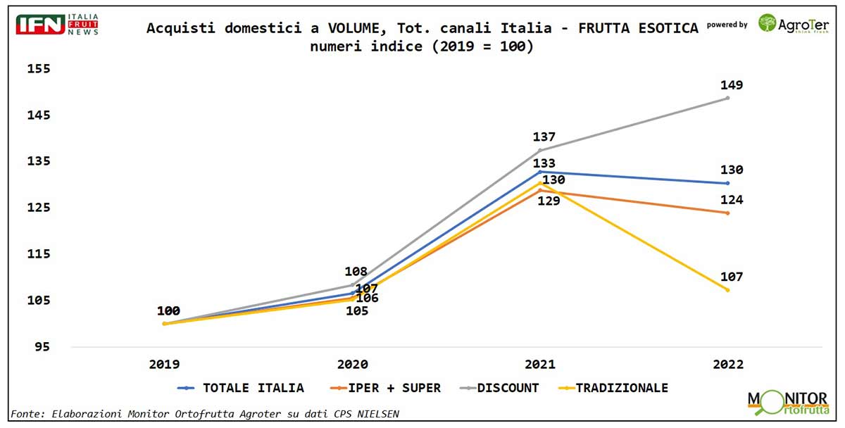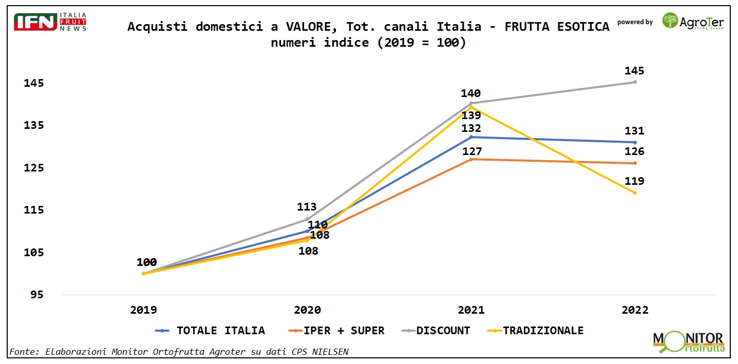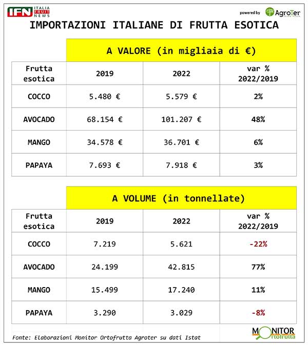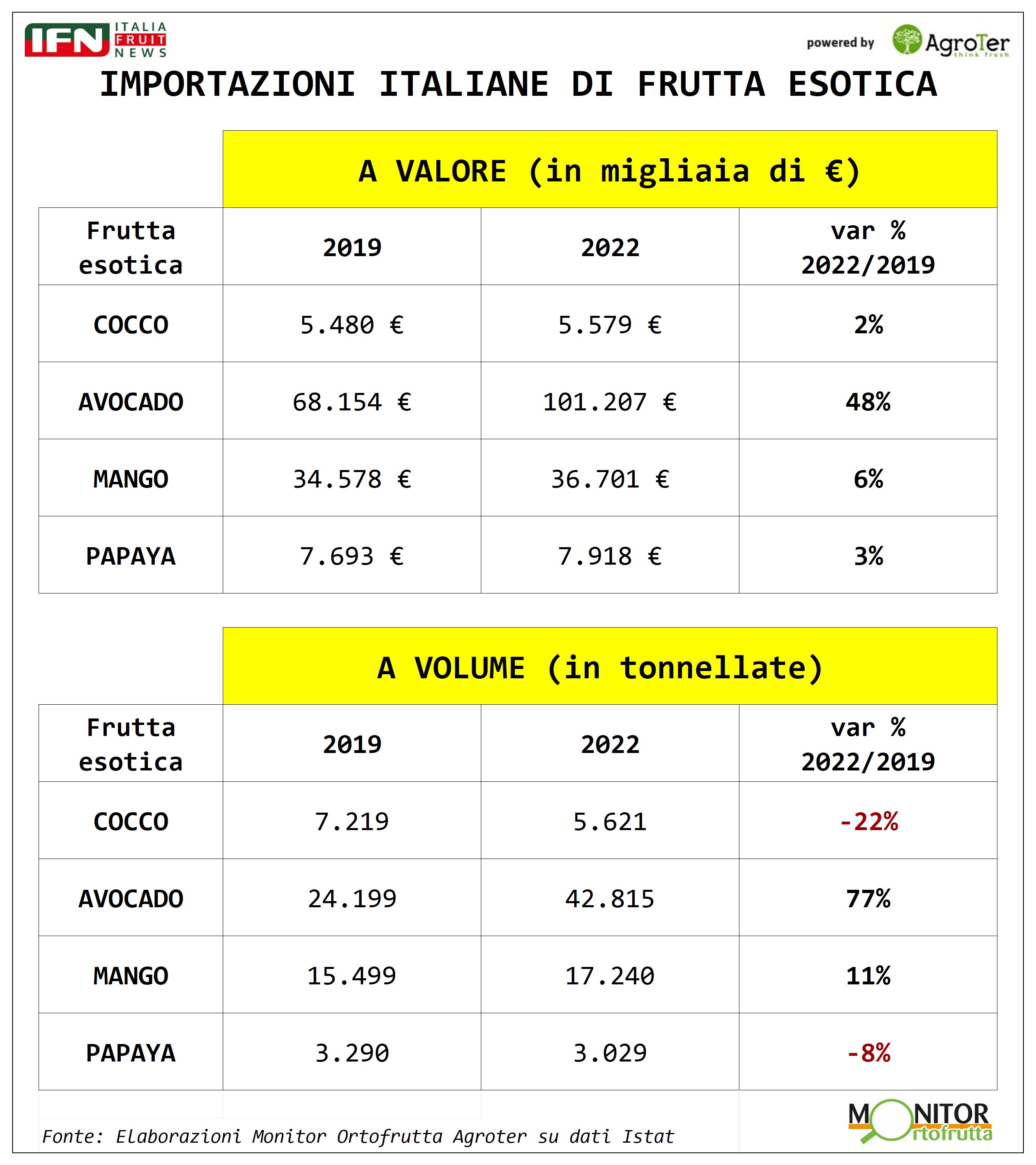 Piuttosto, è interessante notare come tutta la categoria della frutta esotica (escluse banana ed ananas che oramai sono due categorie a sè stanti) sia cresciuta mediamente del 30% sia a volume che a valore – in flessione su tutti i canali a parte il solito discount – un dato che si abbasserebbe ulteriormente senza l’exploit dell’avocado. Infatti, le importazioni di mango, papaia e cocco, dal 2019 al 2022 sono lievemente cresciute a valore, in un range fra il 2 e 6%, mentre a volume assistiamo addirittura ad un calo, come nel caso della papaia (-8%) e del cocco (-22%). Nel mango, invece, le quantità importate aumentano dell’11%.