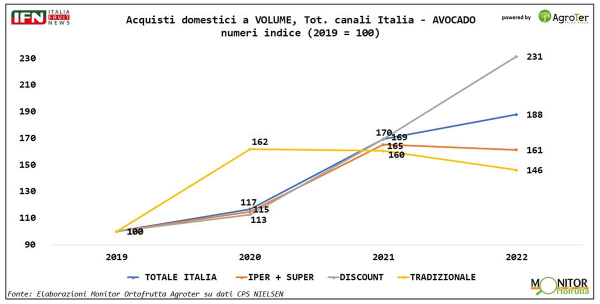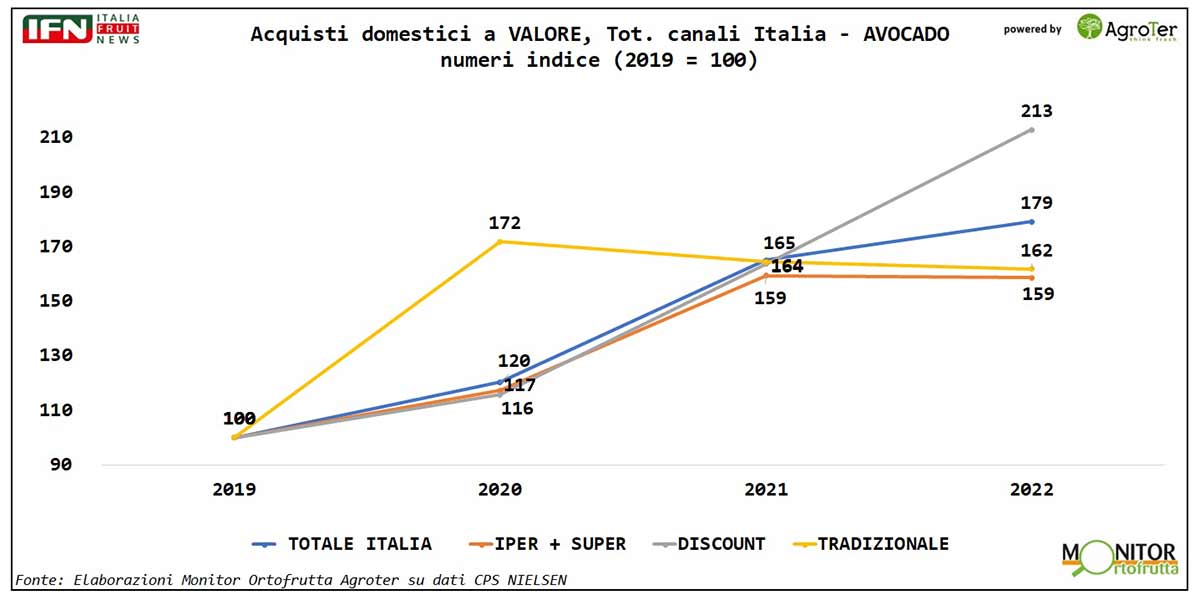 Una crescita di 113 punti a valore e 130 a volume nell’arco di 4 anni. Le analisi del Monitor Ortofrutta di Agroter certificano una performance a dir poco prorompente dell’avocado nei discount.