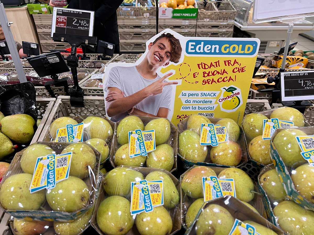 Un altro elemento particolarmente apprezzato è l’elevata shelf life: “Che permette di ridurre al minimo gli sfridi in negozio, che sappiamo essere piuttosto importanti nella categoria delle pere. Inoltre, questo ci consente di gestire la vendita di Eden Gold per tanti mesi, senza difficoltà, pianificando così un’espansione commerciale anche all’estero, dove siamo già presenti in Austria e Germania, a cui si aggiungeranno dal prossimo anno Croazia, Slovenia, Danimarca e Scandinavia, dopo i test favorevoli condotti in questa campagna”.