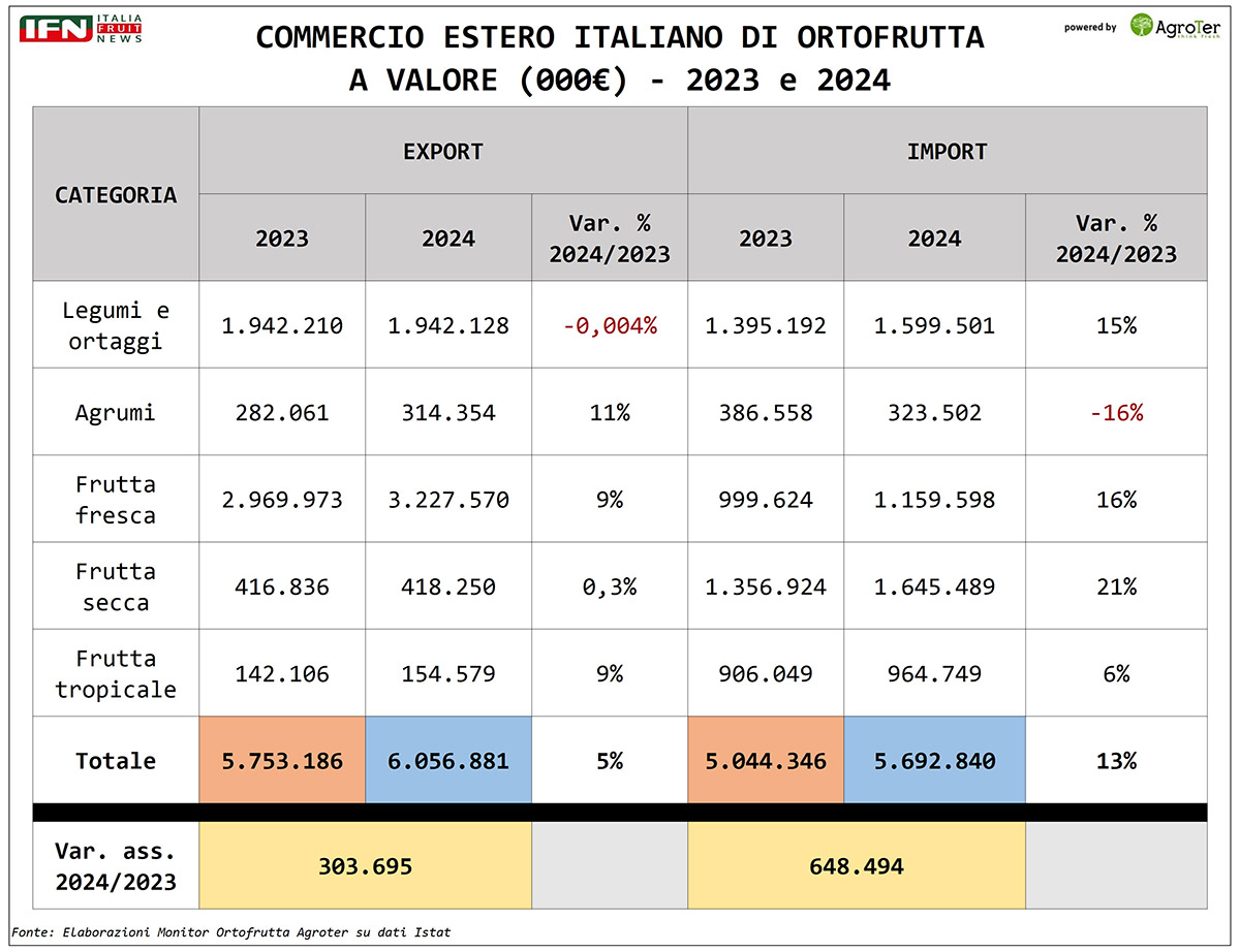 Nel 2024, l'export ortofrutticolo italiano ha registrato un incremento sia a volume (+9%) che a valore (+5%), superando la soglia dei 6 miliardi di euro di vendite. Tuttavia, l'aumento delle importazioni ha seguito un ritmo ancora più sostenuto in termini di valore (+13%), mentre il volume è cresciuto nella stessa misura dell'export (+9%).
