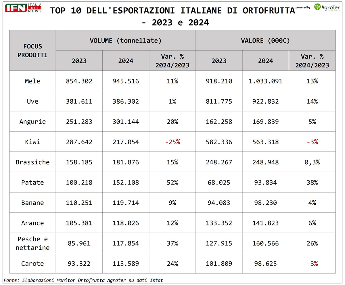 TOP 10 Export: mele leader assolute a volume; bene l’uva da tavola a valore. Patate best performer