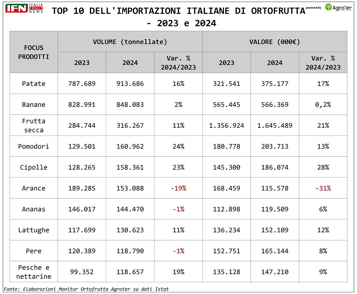 Sul fronte delle importazioni a volume, il podio è occupato da patate, banane e frutta secca, con i trend di crescita più marcati per patate e frutta secca, mentre le banane mostrano un incremento più contenuto. Tuttavia, in termini di valore, il primato assoluto spetta alla frutta secca, che ha generato un giro d'affari superiore a 1,5 miliardi di euro. La performance più significativa riguarda le cipolle, che registrano un aumento del 23% a volume e del 28% a valore. La scarsità di prodotto nazionale ha chiaramente favorito questa dinamica commerciale. In controtendenza, invece, le importazioni di arance, che risultano in calo.